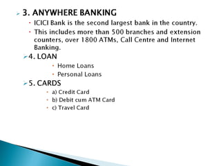 The document discusses the 7 Ps of the marketing mix for services marketing using ICICI Bank in India as a case study. The 7 Ps include product, price, place, promotion, people, physical evidence, and process. For ICICI Bank, their products and services include banking, credit cards, demat services, mobile banking, and NRI services. Their pricing, locations of branches and ATMs, and types of promotional activities are also outlined. The document concludes that having strong presence across all 7 Ps is critical to the success of a service like ICICI Bank.