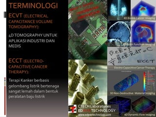 This document discusses the experiences of an Indonesian company in developing and commercializing ECVT and ECCT technologies for cancer diagnosis and therapy. It provides an overview of the company's milestones in developing electrical capacitance volume tomography (ECVT) and electro-capacitive cancer therapy (ECCT) technologies. Key applications of ECVT discussed include industrial process imaging, brain imaging, and breast cancer scanning. ECCT is presented as a non-contact cancer therapy approach. Comparisons of ECVT and other imaging modalities for various applications are also provided.