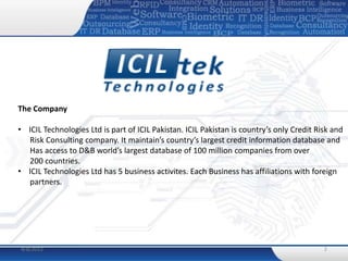 ICIL Technologies provides technology solutions and services including business consulting, ERP implementation, customized software development, BI solutions, and biometric solutions. The company has expertise implementing solutions like Oracle EBS, Microsoft Dynamics, and its own eCorpStructure ERP. ICIL Technologies also offers business continuity and disaster recovery planning services.