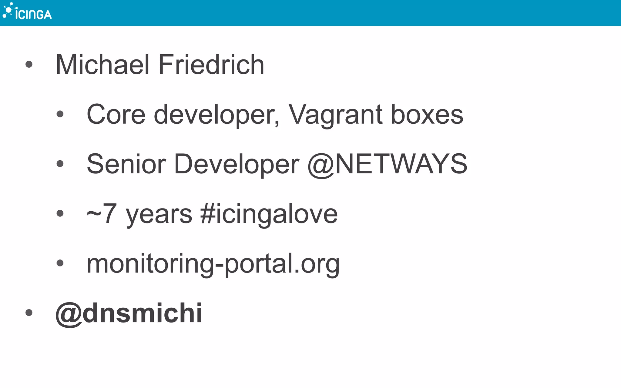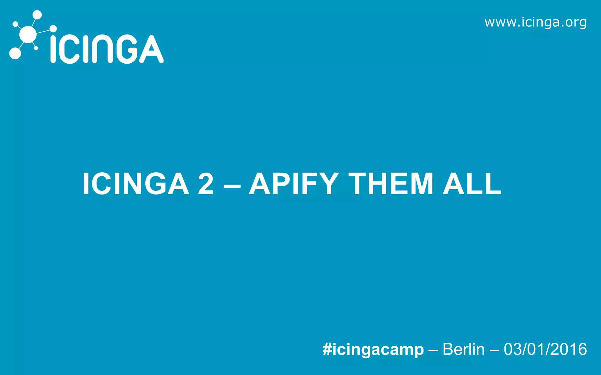 The document discusses Icinga 2, a monitoring tool, focusing on its API features, such as user authentication and permissions management. It highlights the capabilities for configuration management, event streams, and filtering options, alongside example API calls and integrations. The conclusion encourages users to explore Icinga 2 through vagrant boxes and the API documentation.