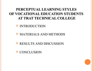 This document summarizes a study on the perceptual learning styles of vocational education students at Trat Technical College in Thailand. The study surveyed 170 students across 6 programs to determine their preferences on a scale for visual, auditory, kinesthetic, tactile, group, and individual learning styles. The results showed that group, kinesthetic, and auditory styles were the major preferred learning styles, while visual, tactile, and individual styles were minor preferences. There were also statistically significant differences found in the learning style preferences between students in the Electrical Power Technology, Electronics Technology, and Accounting programs compared to the other programs. The study concludes that understanding students' learning styles can help teachers design their lessons and activities to be more