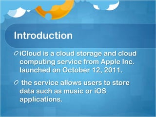 iCloud is Apple's cloud storage and computing service that allows users to store and access music, photos, documents, and other files across their Apple devices. Key features of iCloud include storing and syncing purchased content, photos, files and backups across devices; finding lost Apple devices on a map; keeping passwords and settings updated across devices; and automatically backing up iOS devices daily over Wi-Fi. iCloud offers advantages like easy syncing of content between devices without cables, but also has some disadvantages like compatibility only with Apple devices and possible security issues when multiple devices are synced to one account.