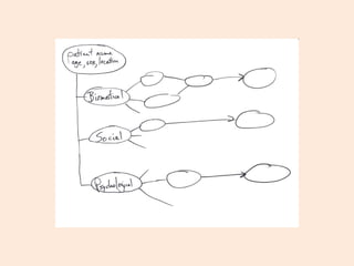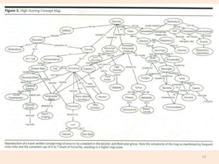 The document discusses concept maps and their use in medical interviewing. Concept maps are a graphical representation that show relationships between concepts using nodes connected by links. They can help organize information gathered from patient interviews by showing interrelationships between symptoms, problems, concerns and other case components. Students are instructed to conduct a mock patient interview, construct a concept map as a group to represent the case, and present their map to the class.