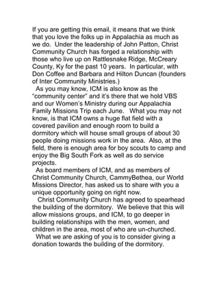 Christ Community Church has partnered with Inter Community Ministries for 10 years to provide outreach in rural Appalachia. They are seeking donations to build a dormitory on ICM's property that would house mission groups of around 30 people doing service projects in the area. The dormitory would allow groups to strengthen relationships and do more outreach with the local unchurched community.
