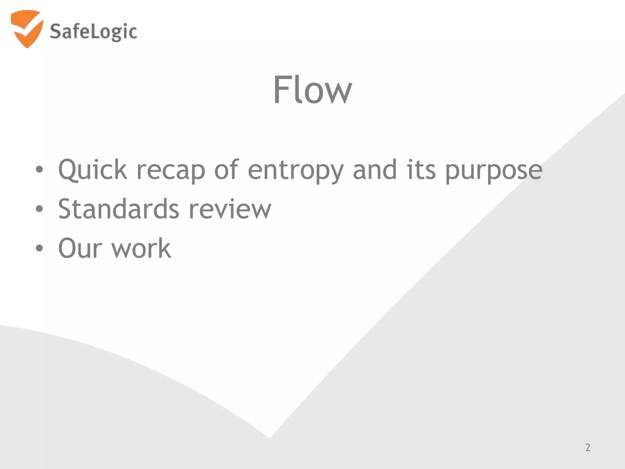 The document discusses entropy in the context of cryptography, highlighting its significance in generating random bits and ensuring secure authentication protocols. It reviews various NIST standards and requirements for entropy sources and the challenges of generating truly random data on computers. Additionally, the document introduces a product called ChaosControl, which aims to provide a compliant solution for random bit generation.