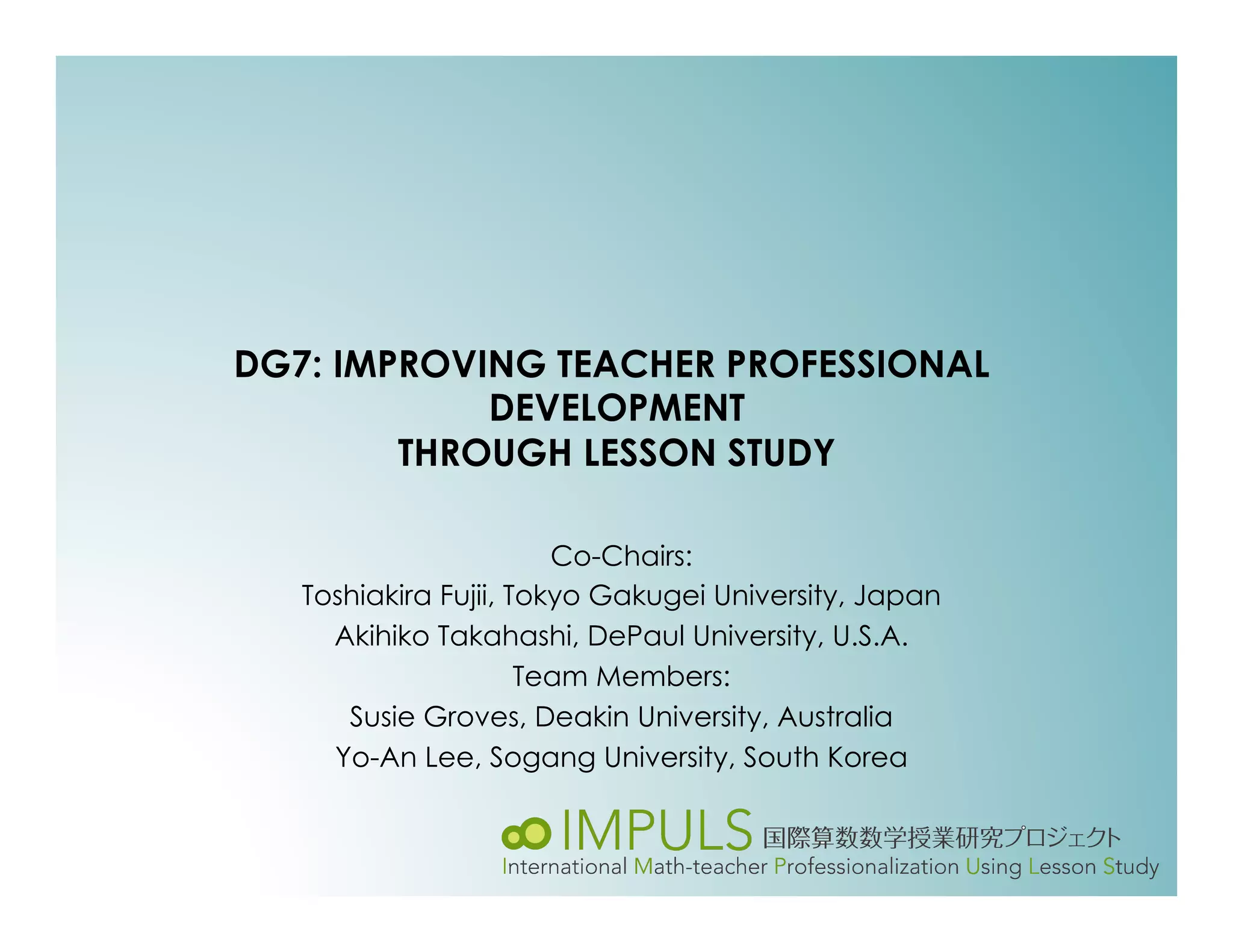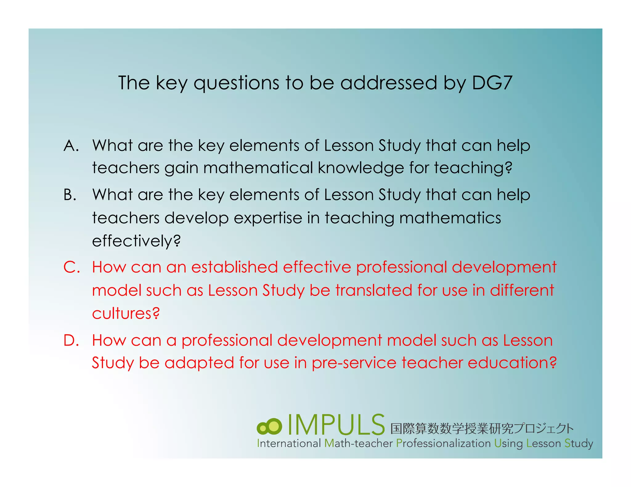 This document discusses adapting the Japanese lesson study model of professional development for use in different cultures. It outlines some potential obstacles to translating lesson study between cultures, such as differences in educational systems, teacher views and experience levels. The document emphasizes that lesson study is a collaborative, reflective process focused on student learning. It provides an example of how key elements of lesson study could be incorporated into a university course for pre-service teachers in Germany. Finally, it discusses how the reflective principles of lesson study align with Dewey and Schon's views of reflection as developing and testing hypotheses through action in a collective, iterative process.