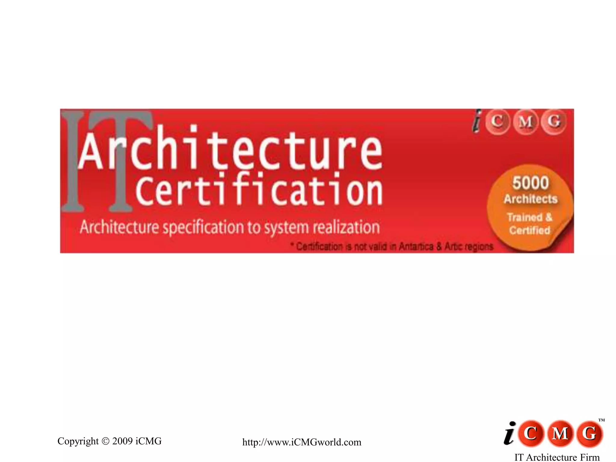 iCMG is a global leader in architecture services that offers a complete stack of architecture services focused on areas like enterprise architecture frameworks, model-driven architecture, component-based product lines, and service-oriented architecture. iCMG provides various certification options for IT architects including essential certification involving online testing as well as certified architect certification involving case study and panel presentation. iCMG also offers architecture center of excellence services including workshops, training programs, skill assessments, and governance reviews to help organizations reduce costs and improve productivity through architecture.