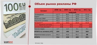 Документ представляет собой анализ рынка рекламы в Российской Федерации, сосредоточенный на конкретных регионах Урала и включает данные по объемам и динамике рекламных расходов в различных сегментах, таких как телевидение, радио, пресса и интернет. Основное внимание уделяется активности рекламодателей, наиболее эффективным инструментам интернет-рекламы и структуре рекламных агентств. Документ также выделяет ключевых игроков на рынке и их акценты в продвижении.