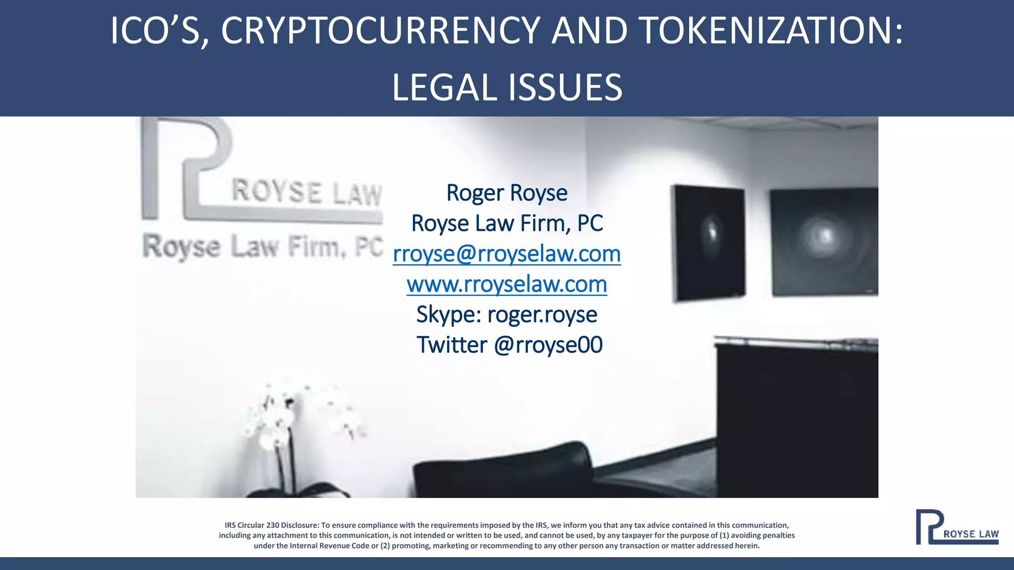 The document discusses regulatory and legal considerations surrounding Initial Coin Offerings (ICOs), cryptocurrency, and tokens, emphasizing the classification of tokens as securities under various regulatory frameworks including the SEC and CFTC. It highlights the compliance requirements for participants in ICOs, including registration and reporting obligations, as well as potential tax implications associated with cryptocurrencies. Furthermore, it outlines the distinction between different types of offerings and the potential risks and regulatory scrutiny involved in cryptocurrency trading platforms.