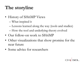 SHriMP Views was an early software visualization tool that provided hierarchical multi-perspective views of code to aid program comprehension. It was evaluated through empirical studies and evolved over time based on lessons learned. The document discusses the history and development of SHriMP Views, lessons learned about tool design and evaluation, and promising areas for future work in software visualization and exploration tools.