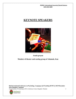 The document outlines the 9th International Conference on Psychology, Language and Teaching held in Bangkok in December 2016, featuring keynote speakers and various presentations on educational issues. One significant focus is the call for radical changes in primary education in India, highlighting the need for compulsory and free education for all, the importance of addressing poverty's impact on education, and the requirement for improved educational infrastructure and policies. Additionally, studies from various researchers discuss topics such as aggression among sports and education students, educational beliefs among preservice teachers from Malaysia and China, and the relationship of self-efficacy and organizational commitment in Generation Y.