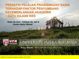 Kajian ini meneliti persepsi pelajar prasiswazah di Fakulti Sains, UPM mengenai faktor yang menyumbang kepada kecemerlangan akademik, termasuk persekitaran pembelajaran, sikap, dan sokongan luar. Hasil analisis menunjukkan pola serupa antara pelajar UPM dan UTM, di mana faktor persekitaran dan sikap belajar secara signifikan mempengaruhi kejayaan akademik. Penekanan juga diberikan kepada pentingnya pengurusan masa dan hubungan dengan pensyarah untuk mencapai kecemerlangan.