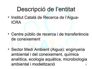 Descripció de l’entitatInstitut Català de Recerca de l’Aigua-ICRA Centre públic de recerca i de transferència de coneixement Sector Medi Ambient (Aigua): enginyeria ambiental i del coneixement, química analítica, ecologia aquàtica, microbiologia ambiental i modelització