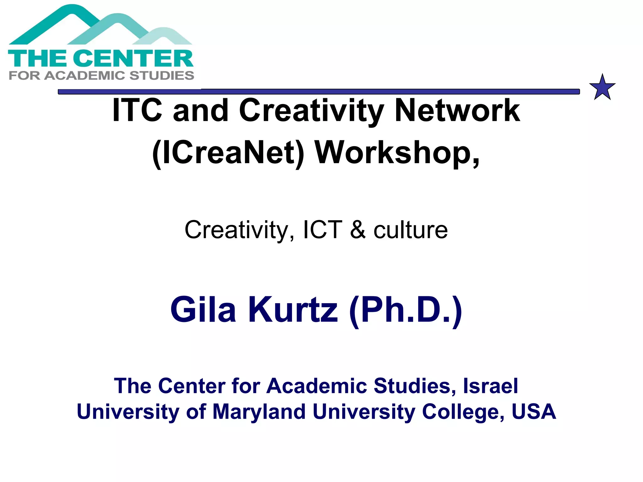 This document discusses creativity in education and its development through information and communication technologies (ICT). It provides context on Israel as a multi-cultural society and outlines how online technologies can foster creativity in educational settings by promoting skills like critical thinking. The document also touches on defining e-learning and developing creativity and skills for online learning.