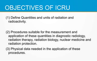1. ICRU Report 83 provides guidelines for prescribing, recording, and reporting intensity-modulated radiation therapy (IMRT). It emphasizes using dose-volume histograms and statistics like median dose to describe dose distributions.