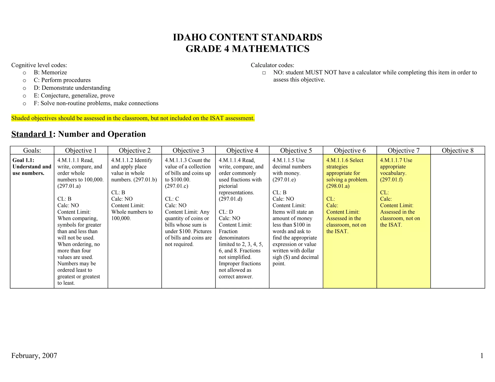 3) Shaded objectives are taught but not assessed on the Idaho Student Achievement Test (ISAT). The document provides details on content limits and formats for assessing each objective.