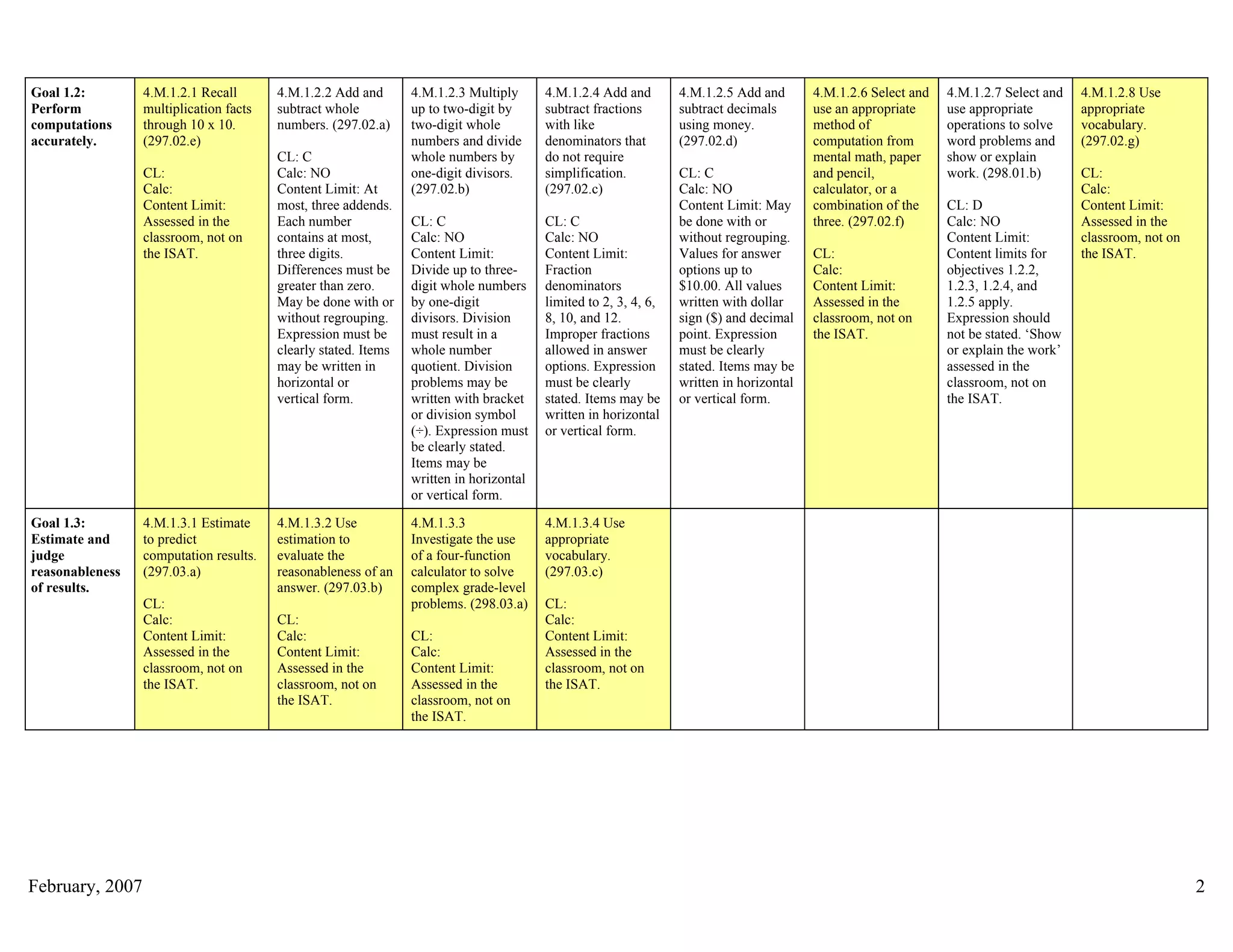2) For each goal there are multiple objectives that specify skills students should master by 4th grade. The objectives are coded by cognitive level and whether a calculator can be used.