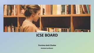 The Indian Certificate of Secondary Education (ICSE) is a private board established in 1958 that conducts the ICSE examination for 10th grade and the Indian School Certificate (ISC) examination for 12th grade. It is governed by the Council for the Indian School Certificate Examinations (CISCE). The CISCE oversees curriculum, examinations, affiliation of schools, and other activities. Schools must meet requirements regarding infrastructure, staff qualifications, academic hours, and more to be affiliated with the CISCE. The ICSE curriculum and examinations focus on developing well-rounded students through a balanced course of study including compulsory and optional subjects.
