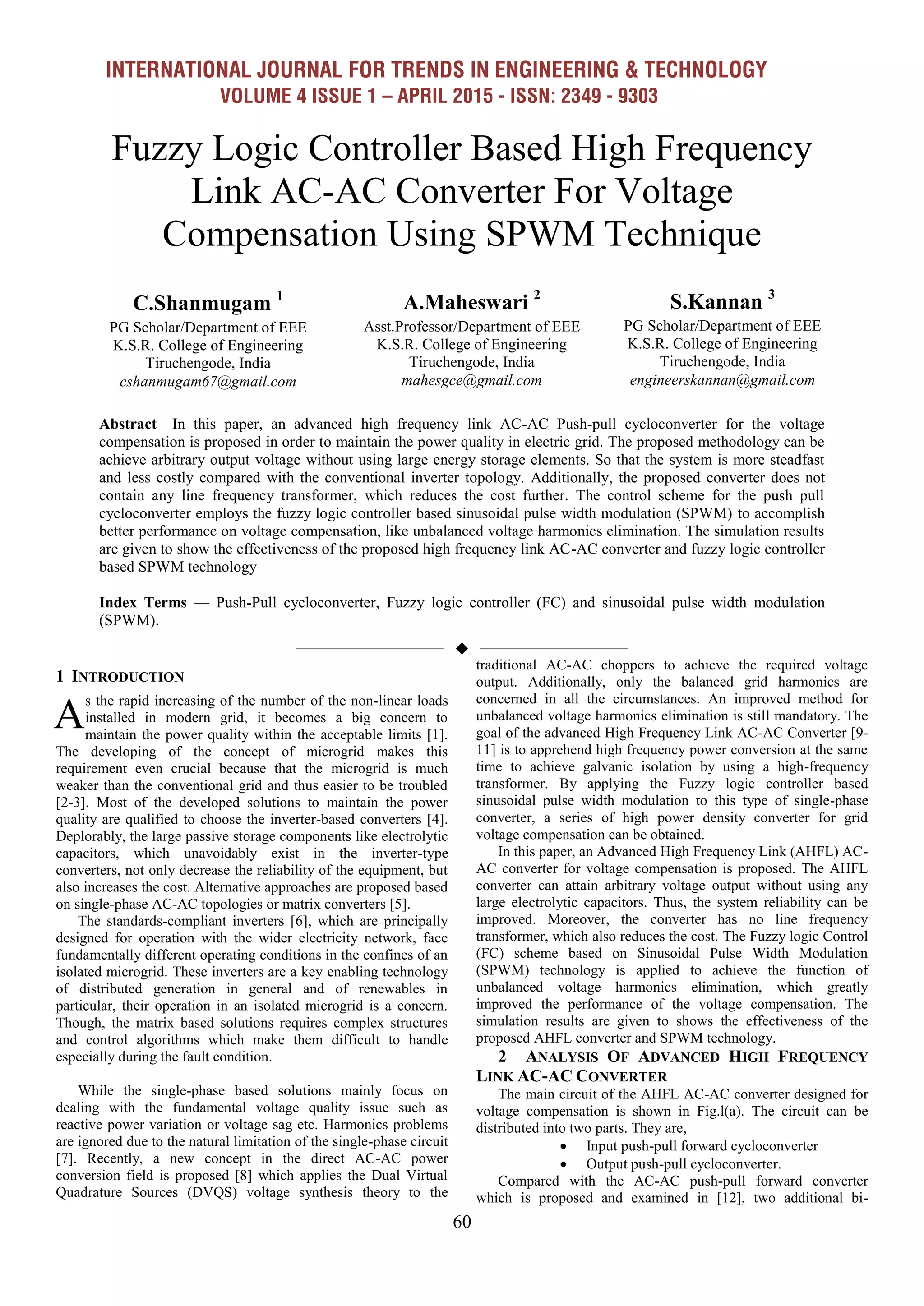 This paper presents an advanced high-frequency link AC-AC push-pull cycloconverter for voltage compensation aimed at enhancing power quality in electrical grids. The proposed converter utilizes a fuzzy logic controller with sinusoidal pulse width modulation (SPWM) for improved performance in eliminating unbalanced voltage harmonics and operates without large energy storage elements or line frequency transformers, thereby reducing costs and enhancing reliability. Simulation results validate the effectiveness of the proposed technology in voltage compensation applications.