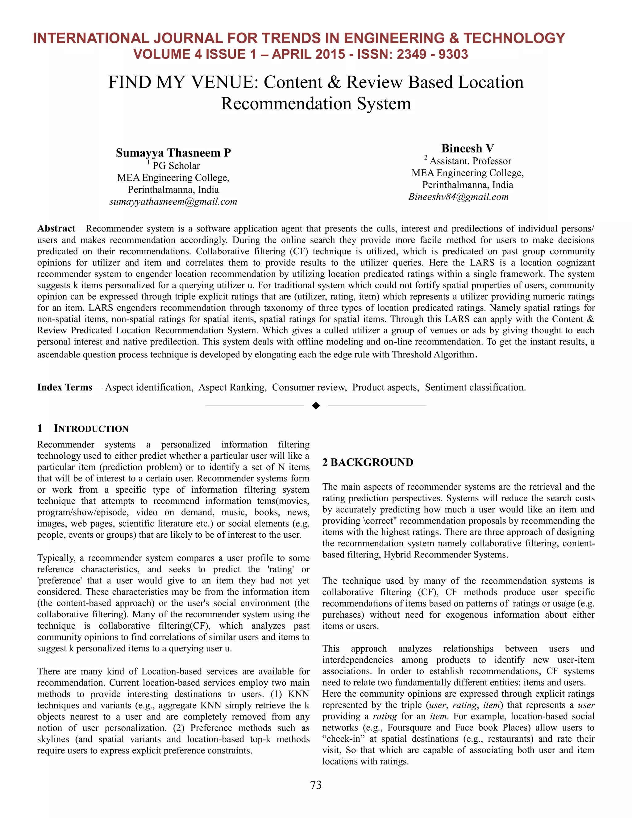 This document discusses a content and review-based location recommendation system that combines user interests with location-based ratings to suggest personalized venues. It utilizes collaborative filtering techniques and proposes a threshold-based algorithm to enhance online recommendations, particularly beneficial for users in unfamiliar cities. The system aims to improve decision-making during online searches by providing tailored recommendations based on individual preferences and local attractions.