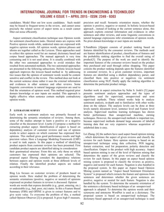 The document presents a method for product feature ranking based on user reviews through sentiment analysis, which classifies opinions as positive, negative, or neutral. It outlines a systematic approach that includes aspect identification, sentiment classification, and ranking, enabling consumers to make informed purchasing decisions while helping firms enhance product quality. The proposed solution addresses challenges related to informal reviews and aims to improve aspect extraction efficiency.