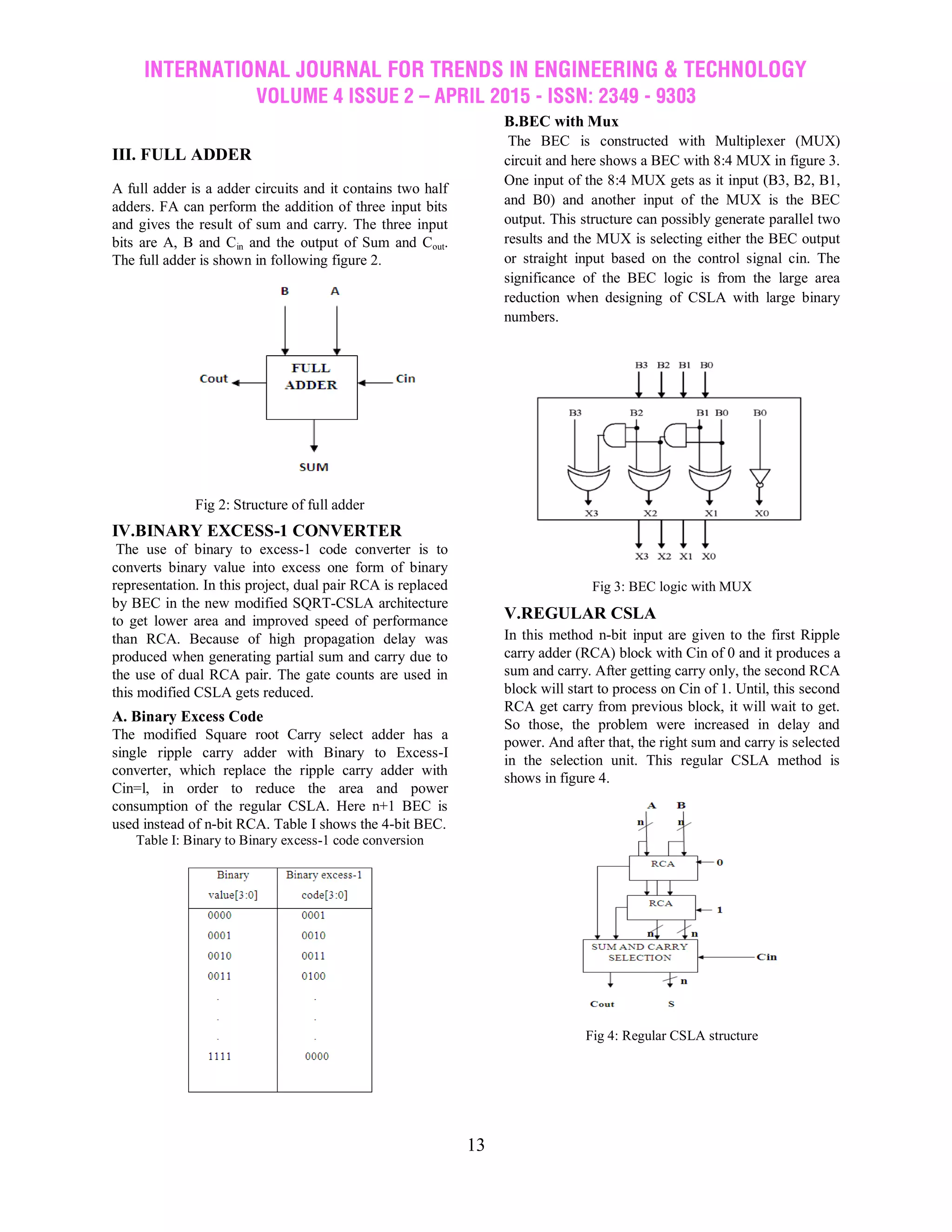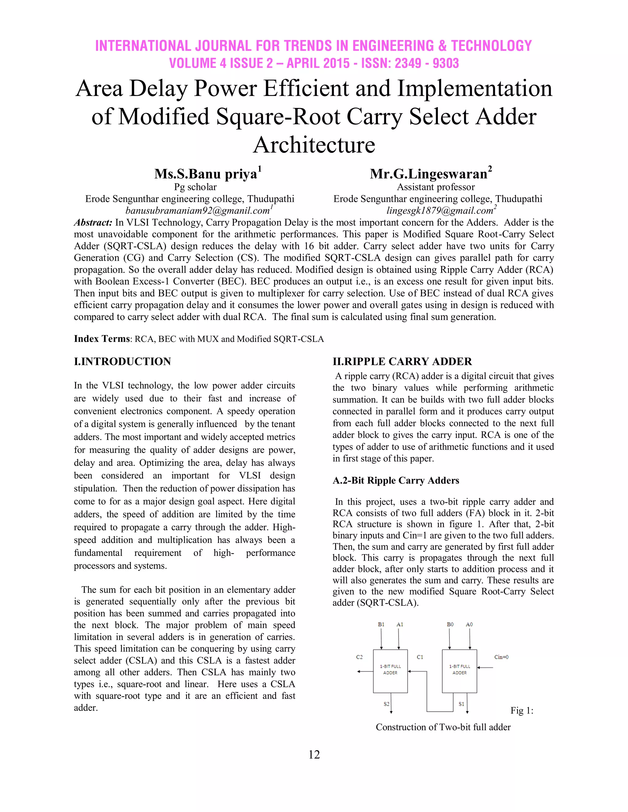 The document discusses a new modified square root carry select adder (sqrt-csla) architecture designed to reduce carry propagation delay in 16-bit adders, achieved by integrating a binary excess-1 converter (BEC) for improved efficiency. This innovative approach results in lower power consumption and fewer gates compared to traditional carry select adders using dual ripple carry adders (RCA). Simulation results indicate enhanced performance metrics, with the modified sqrt-csla achieving a notable reduction in overall delay and power requirements.