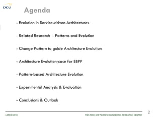 This document discusses using patterns to guide architecture evolution in service-driven systems. It proposes identifying recurring architecture change patterns from logs, formally specifying patterns in a catalogue, and reusing patterns to support evolution. An example evolution case integrating a new component is presented. A pattern-based evolution process involves specifying changes, retrieving relevant patterns, and instantiating patterns to implement the changes. The approach is experimentally analyzed using evaluation scenarios and a prototype for automated pattern-based evolution. Maintaining a pattern library could help discover, specify and reuse patterns to guide architecture-centric software evolution.
