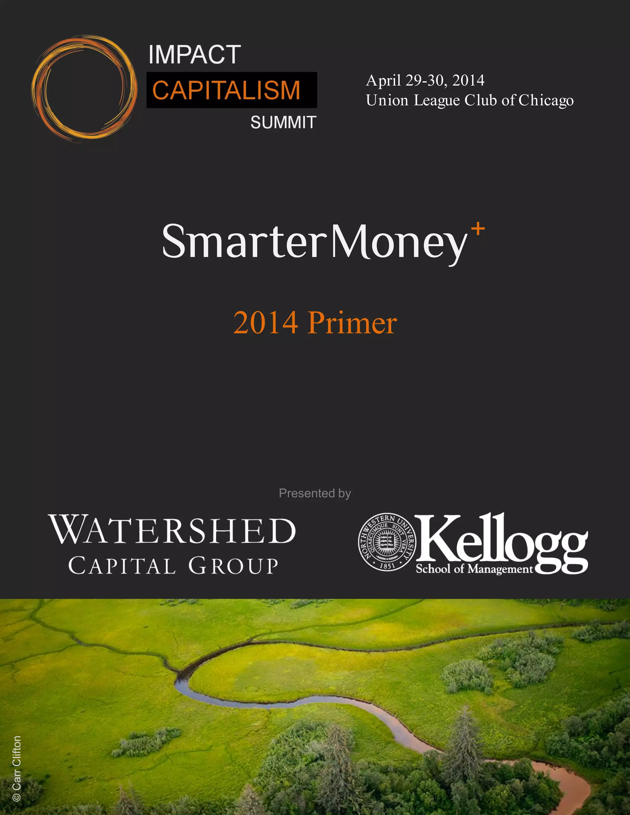 The document is a primer for the 2014 Impact Capitalism Summit. It discusses how impact investing portfolios can outperform traditional investing by incorporating environmental, social and governance factors that are knowable but often ignored. It provides evidence that portfolios focused on high-impact companies can achieve lower risk and higher returns than benchmarks. The primer includes articles making the case for impact investing across different asset classes as part of a responsible investment strategy. It also profiles the summit organizers, Watershed Capital Group, and their experience assisting companies with sustainability solutions.