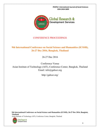 The document outlines the proceedings of the 9th International Conference on Social Science and Humanities held in Bangkok on December 26-27, 2016, featuring various research papers on topics including Sri Lankan dance traditions, Indian Arabic poetry's role in social reform, women's empowerment in Pakistan, partner engagement in business relationships, and the challenges faced by Tibetan and Afghan refugees in India. Each paper addresses significant social, cultural, and historical issues, highlighting the need for further research and discussion in these areas. The conference serves as a platform for sharing insights and fostering collaboration among scholars and practitioners in the social sciences.