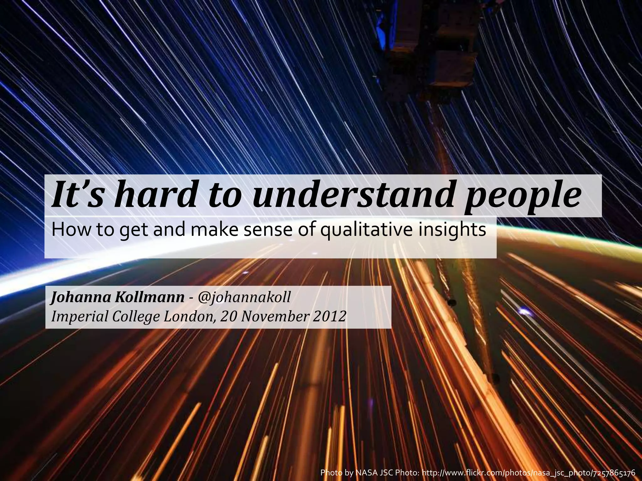 This document provides guidance on conducting qualitative user research interviews. It discusses planning interviews, including determining topics and having open-ended prompt questions ready. It recommends asking open questions without leading, and provides examples of good all-purpose questions. The document also offers tips for conducting interviews, such as being a learner not an expert and listening well. It cautions against being interrogative or asking for solutions during interviews. Lastly, it notes the importance of making sense of what was observed and heard from interviews.
