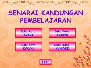 Dokumen ini mencatatkan senarai aktiviti pembelajaran berkaitan suku kata dengan pelbagai contoh perkataan. Setiap perkataan diiringi dengan susunan suku kata yang berbeza-beza. Terdapat juga pilihan untuk menamatkan aktiviti yang sedang dijalankan.