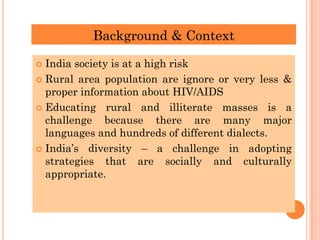 This document discusses the challenges of providing HIV/AIDS information literacy in India. It notes that rural populations have little access to proper information due to language barriers and cultural diversity. Libraries can play a key role by partnering with health organizations to disseminate culturally appropriate information through various formats and platforms. However, there are still challenges around resources, infrastructure, and addressing diverse information needs across India. Information professionals must find new ways to empower communities and reduce stigma through advocacy and access to relevant health information.