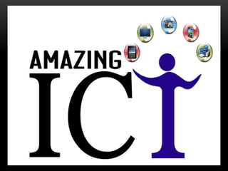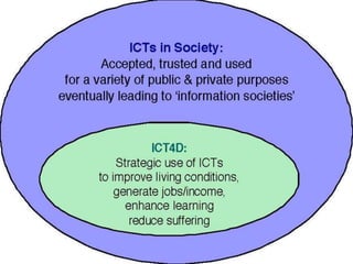 ICT stands for Information and Communication Technologies and focuses on telecommunications like the internet, cell networks, and satellites. Modern ICT allows users worldwide to communicate in real-time through tools like instant messaging, video chat, online games, and social media. ICT has impacted society in many ways by changing jobs, education, crime fighting, retail, health, banking, and communication.