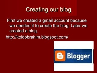 Koldo and Brahim created a blog by first making a Gmail account to create it. They personalized their blog by changing colors, templates, and fonts. Their first article was about Western Sahara. They added links to make their blog more easy to use. They started writing stories that other groups then continued, and they wrote other groups' stories as well. They designed a time table in Excel and uploaded it to Google Docs to link to their blog. They also made a table with Nobel Prize winners from 2000 to the present using Google Docs spreadsheets. Their latest work was choosing a Nobel Prize winner, Paul C. Lauterbur, to write about.
