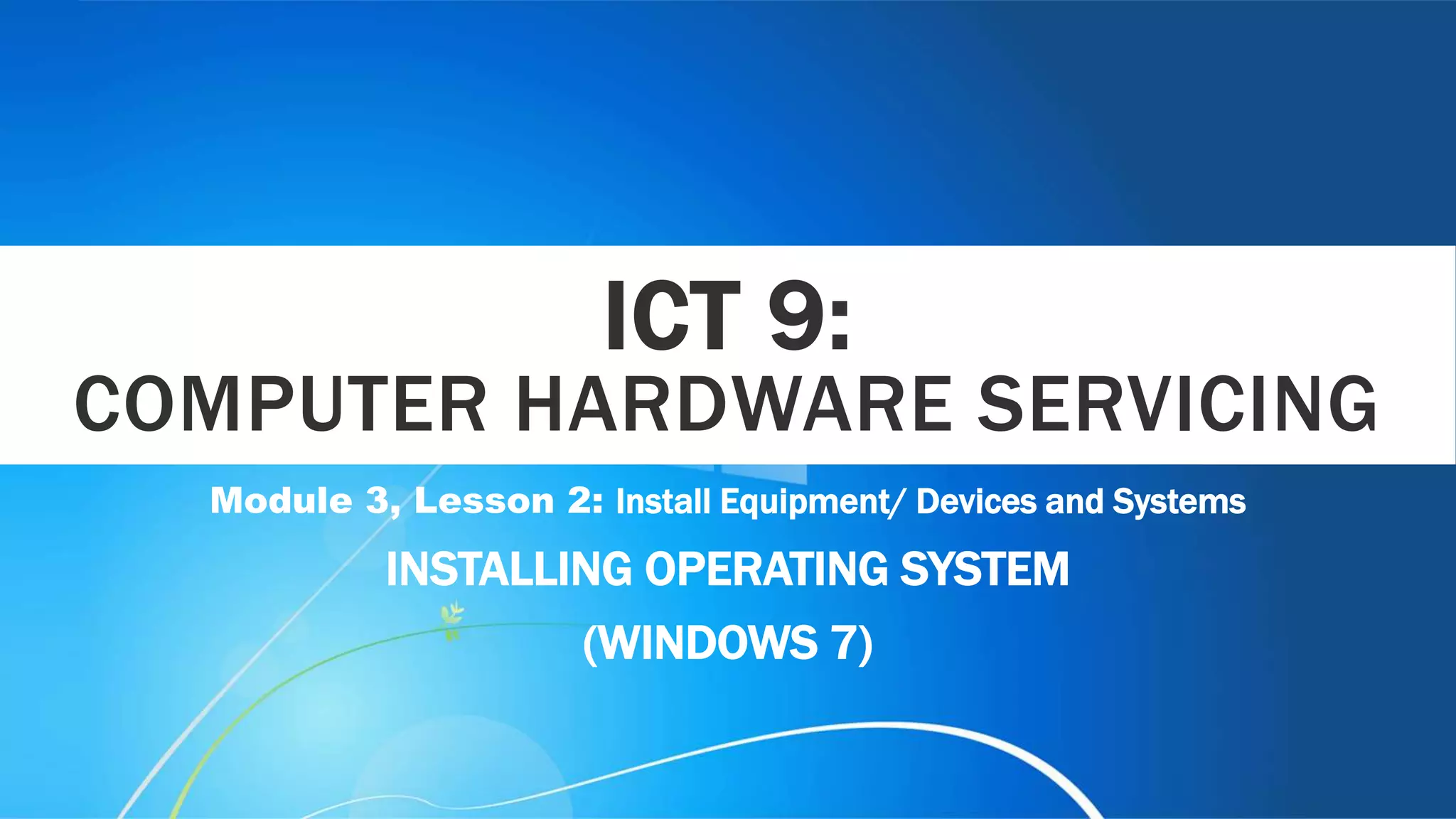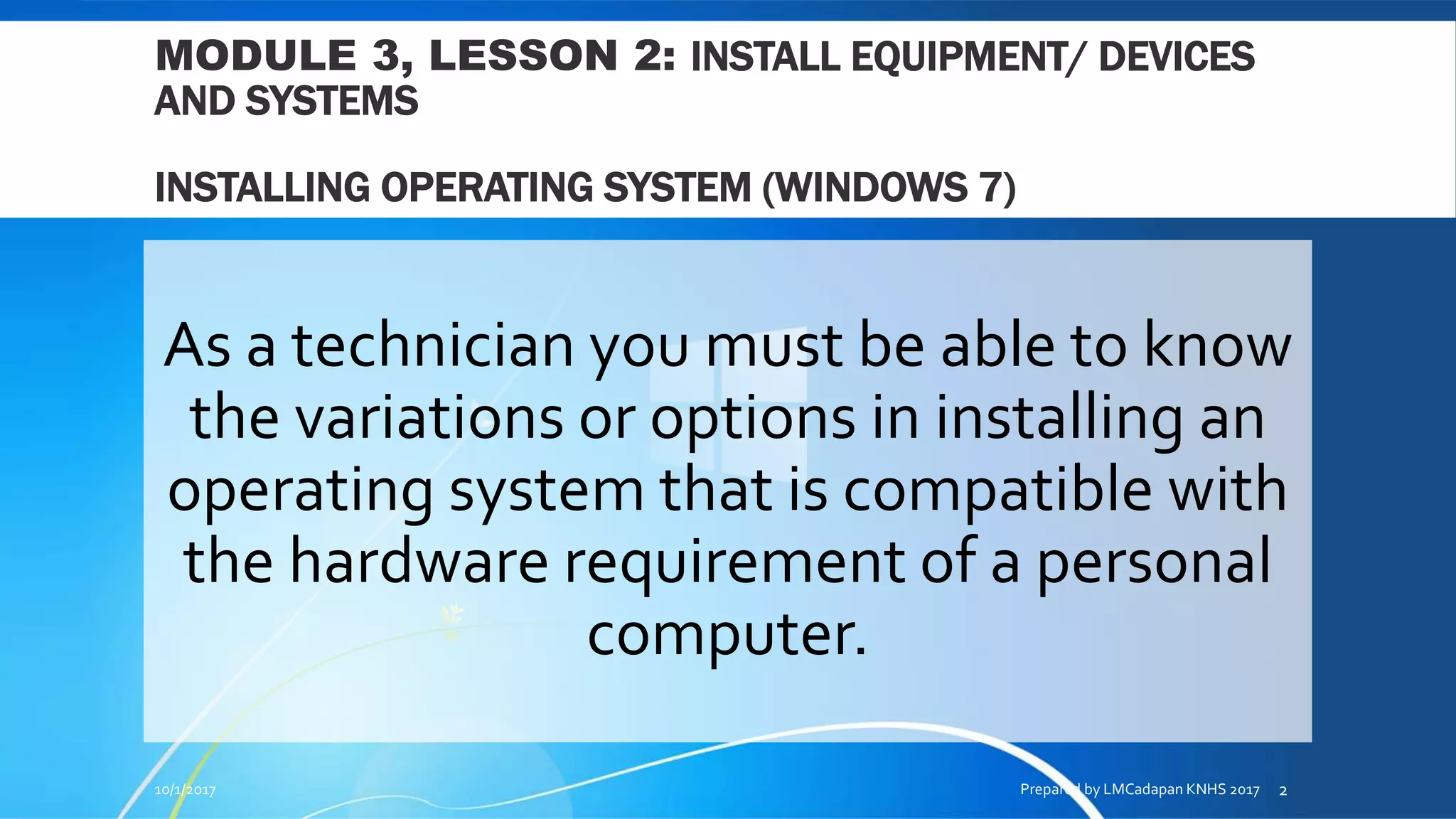 The document provides step-by-step instructions for installing the Windows 7 operating system on a personal computer. It explains that Windows 7 is one of the most widely used operating systems currently available. The installation process involves booting from the Windows 7 DVD, selecting language and time settings, agreeing to license terms, selecting a drive to install to, and going through a series of restarts until setup is complete. Upon completion, the user is prompted to create an account and set preferences for Windows updates.