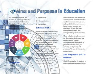 ICT stands for Information, Communication, and Technology. It is an umbrella term that includes all technologies used to communicate information. This includes both hardware and software used to efficiently manage information. ICT in education aims to introduce students to dynamic and popular fields by exposing them to a wide range of information and resources, motivating students to explore and participate. The goals for students are to effectively use ICT tools and applications, integrate ICT into teaching and learning, acquire and create their own digital resources, and participate safely and ethically in digital activities and networks.