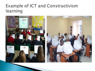 The document discusses ICT (information and communication technologies) and constructivism in education in Tanzania. ICT includes computers, the internet, broadcasting technologies, and telephony. Constructivism views learning as a process where individuals construct meaning based on prior knowledge and experience. The document outlines three types of ICT used in education - interactive whiteboards, mobile phones, and video conferencing. It explains how ICT and constructivism can generate new ways of teaching and learning, and shift from teacher-centered to learner-centered approaches. However, use of ICT in Tanzania faces challenges like lack of funds, qualified teachers, infrastructure, and outdated curriculum. It recommends the government invest more in ICT and education to
