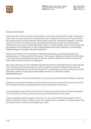 This document provides information about an International Relations course titled "ICT in International Relations" taught by instructor María Florenzano. The course is 6 credits and meets Monday, Wednesday, and Friday from 14:50-16:00 in the Work classroom. It will examine how new information and communication technologies are transforming international relations and diplomacy. Students will critically analyze topics like social media's impact on politics, cybersecurity challenges, and digital diplomacy. Evaluation will include a midterm, final, paper/presentation, and participation. The course uses online tools like Twitter and LinkedIn, and students are expected to develop a critical understanding of course issues.