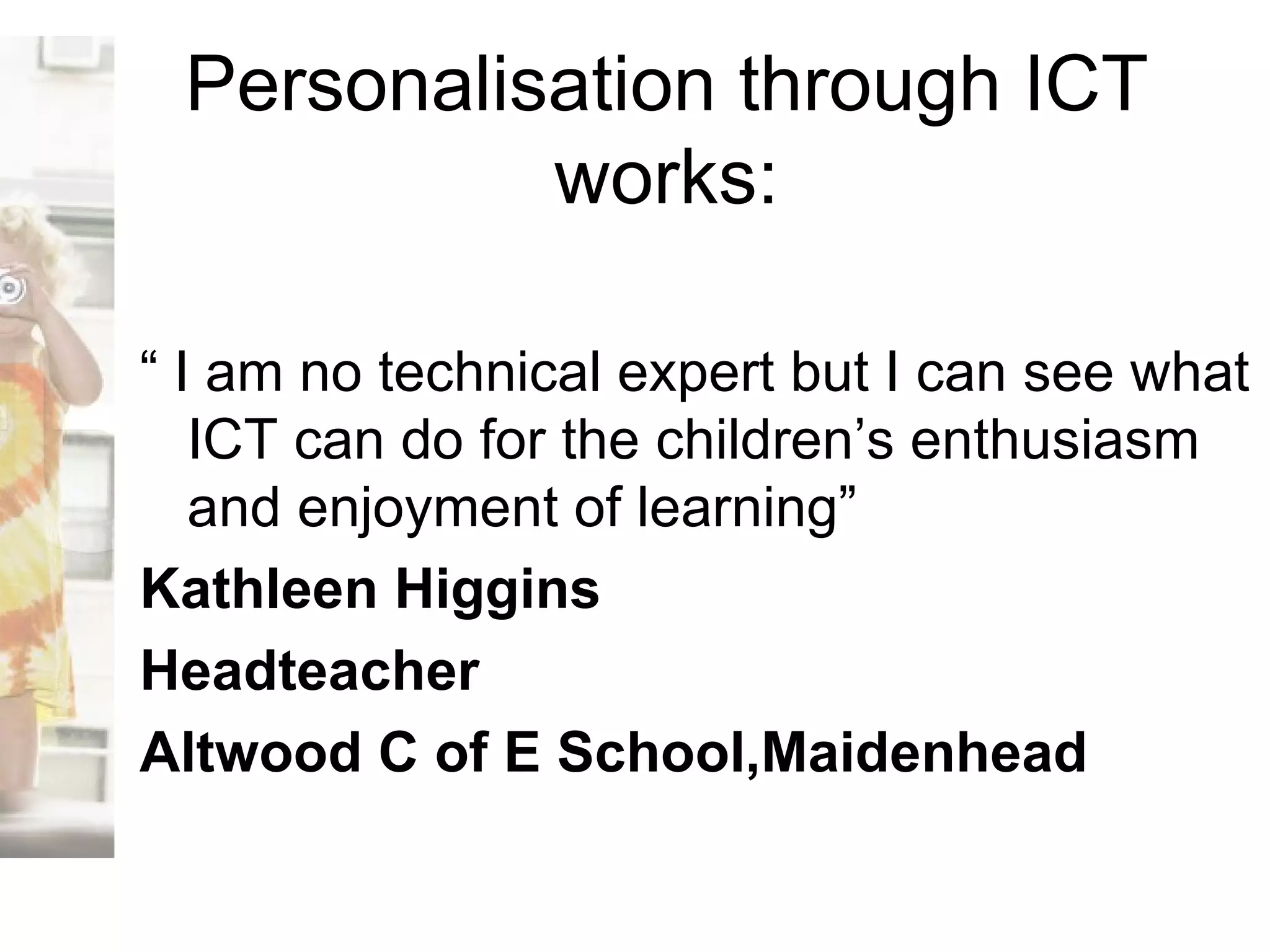 The document discusses how information and communication technologies (ICT) can help personalize learning and engage students. It outlines elements of personalization like interactivity, deeper learning, and student voice that are enabled through ICT. The document also addresses hurdles to personalization through ICT like change management issues, cost implications, and shifting school culture to embrace new technologies. It encourages starting small with personalization projects and emphasizes support from digitally native students and staff members.