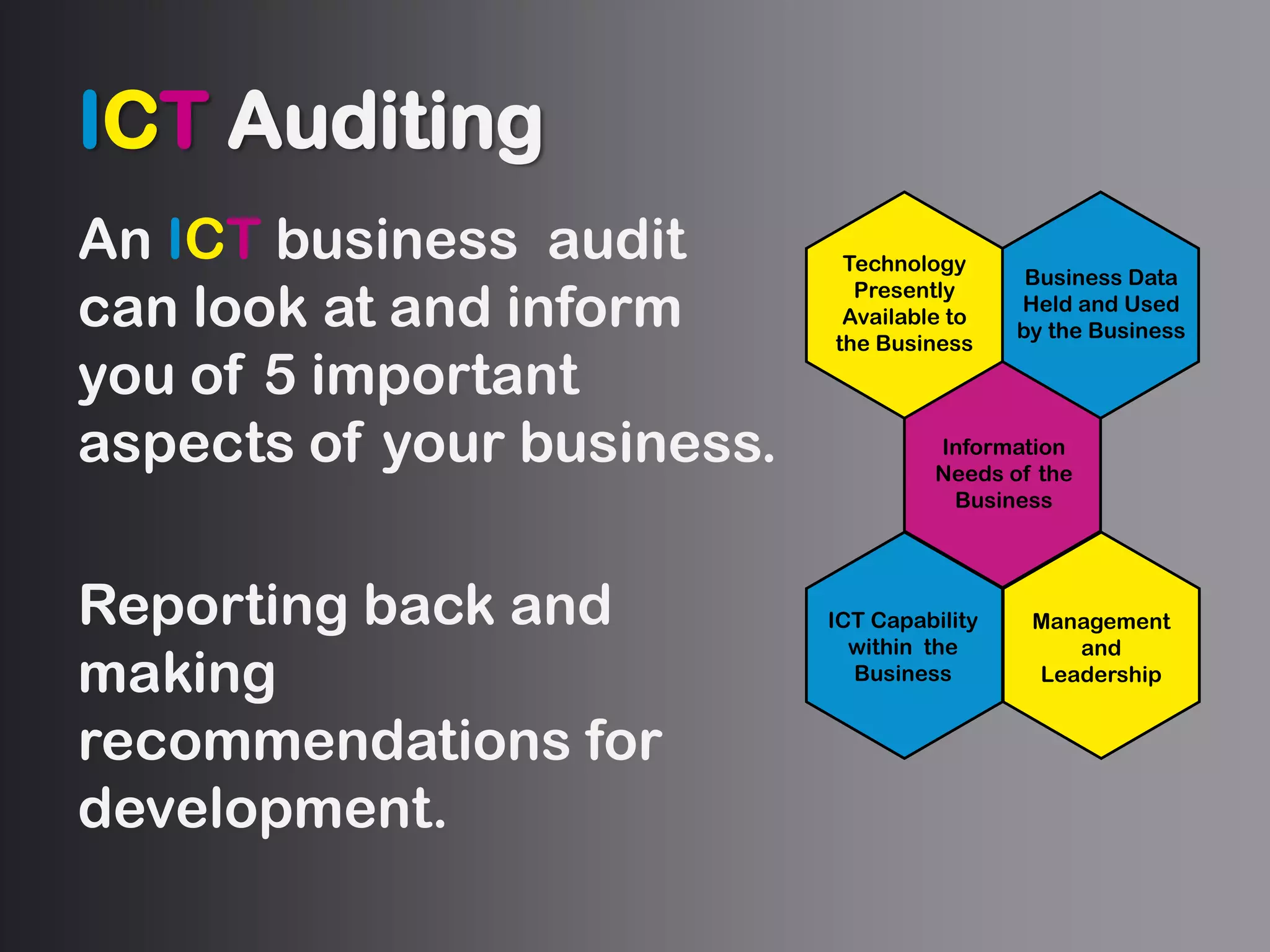 An ICT audit assesses five key aspects of a business, focusing on technology, data management, and individual capabilities while providing recommendations for development. The audit aids in understanding current technology use, data security, and training needs, forming a basis for an ICT development plan that aligns with business goals. Additionally, it enhances decision-making and positions the business for future improvements.