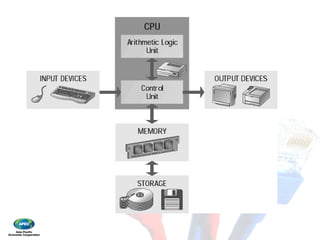 The document provides an overview of the basic components and functions of a computer system. It discusses the four main parts: hardware, software, data, and users. It describes the basic hardware components including input devices like keyboards and mice, output devices like monitors and printers, and storage devices like hard drives, floppy disks, and CDs. It explains the basic functions of inputting, processing, outputting, and storing data. It also provides descriptions of software, communication devices, and computer networks.