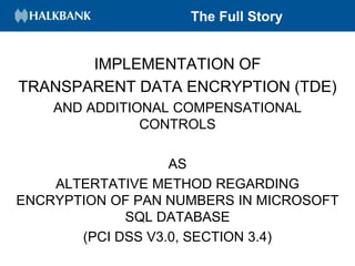 This document discusses implementing Transparent Data Encryption (TDE) and additional compensating controls as an alternative method to encrypting primary account numbers (PANs) in a Microsoft SQL database to comply with PCI DSS version 3 requirement 3.4. TDE provides full data encryption with minimal performance impact. Additional controls like key management and access restrictions are also required. Compensating controls can meet the intent of PCI requirements if they provide similar defense and are above other requirements. TDE benefits include no schema changes and minimal performance impact, but it only encrypts data at rest and does not help secure communication. Proper key backups and access controls must be implemented for TDE.