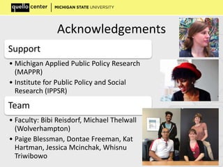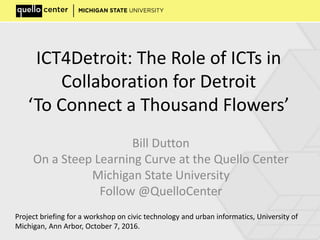 The document discusses the role of information and communication technologies (ICTs) in fostering collaboration and redevelopment in Detroit, focusing on public attitudes towards the city's future and initiatives for improvement. It highlights findings from surveys regarding internet access and social media use, as well as the significance of data-driven organizations and philanthropic efforts in the community. Challenges such as limited internet utilization and risk aversion among charities are noted, but there are positive developments in tech startups and civic engagement initiatives.