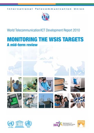 The document is the World Telecommunication/ICT Development Report 2010, which focuses on monitoring progress towards the 10 targets set at the World Summit on the Information Society in 2005. The report assesses achievements to date and what remains to be done to achieve the targets by 2015. It highlights major progress in connecting people through mobile technologies, with near global cellular coverage and over 5 billion subscriptions by 2010. However, it notes that substantial efforts are still needed, as only around 25% of the world's population uses the internet, and broadband penetration outside developed nations remains low at around 3.5%. The report provides a comprehensive, data-driven review of progress towards achieving the WSIS targets and proposes quantitative indicators to measure them.