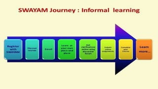 The document provides an overview of various e-educational resources and platforms such as MOOCs, Swayam, Gyan Darshan, Gyan Vani, Sakshat Portal, and e-Gyankosh, highlighting their significance in enhancing education through technology. It outlines the benefits and functionalities of these platforms, including improved access to education, interactive learning, and administrative support for learners and educators. Additionally, it discusses the role of popular digital tools like Wikipedia, Facebook, YouTube, and Google Scholar in facilitating online education and research.