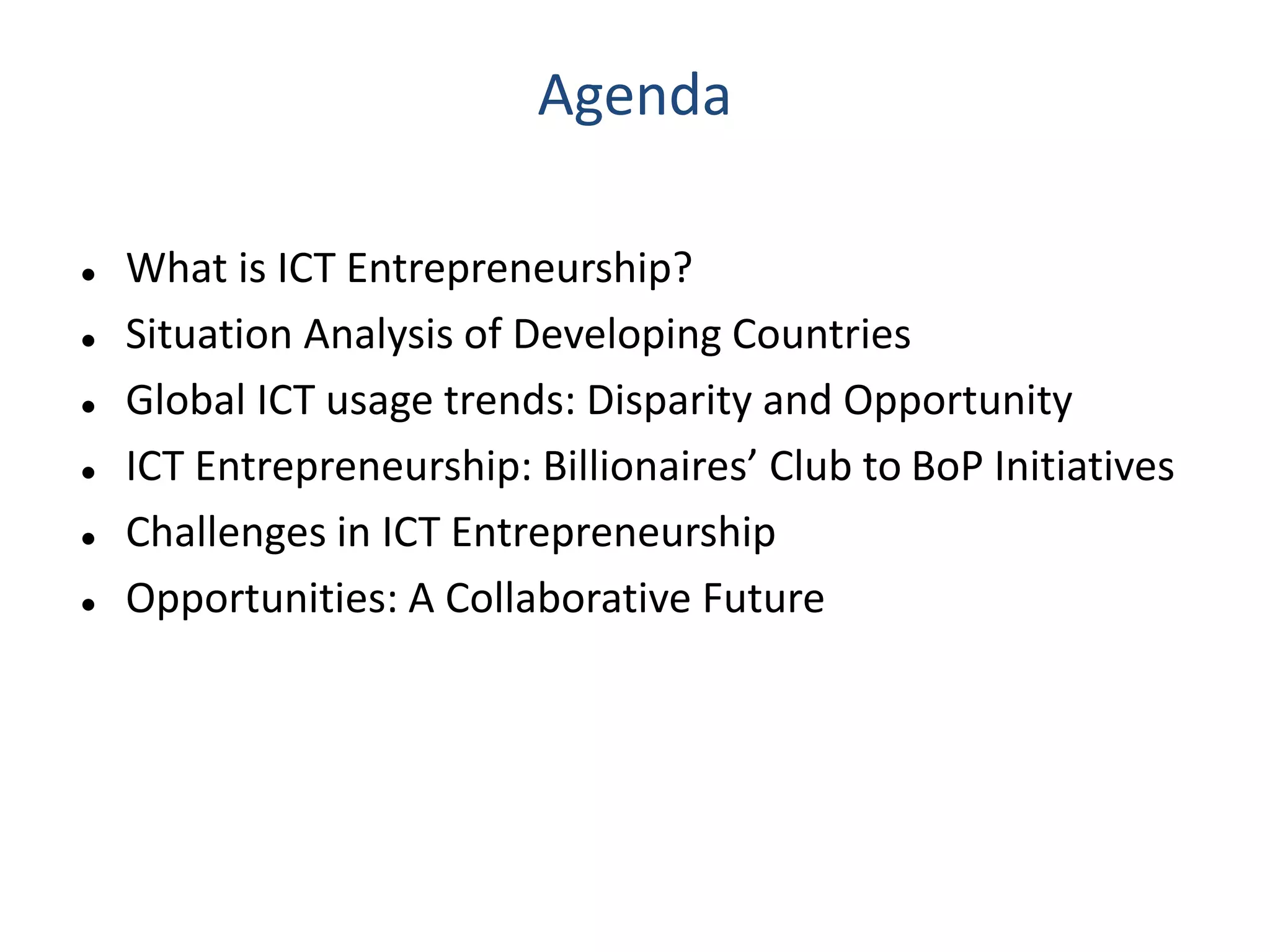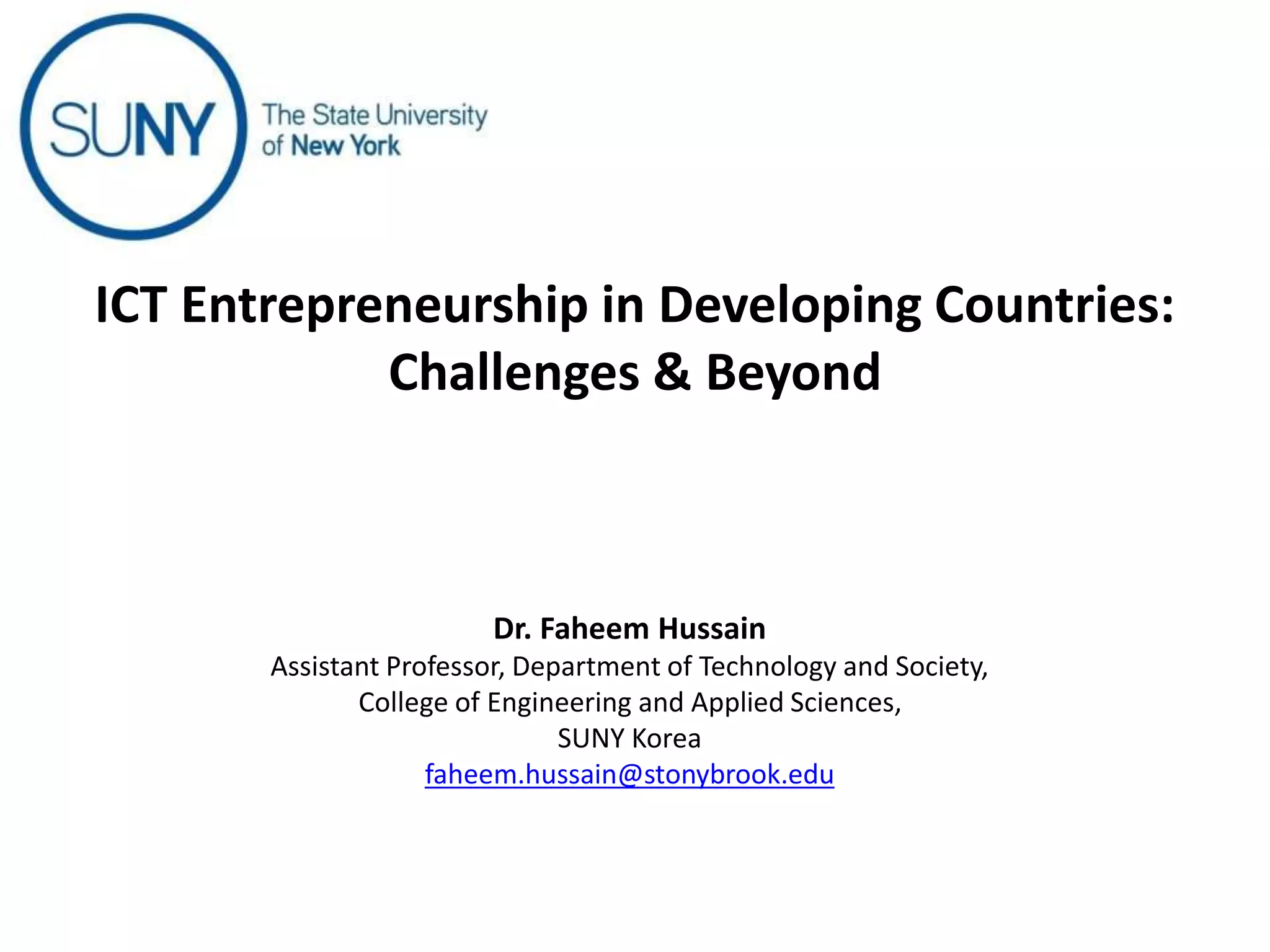 Dr. Faheem Hussain presented on ICT entrepreneurship in developing countries. He discussed how ICT entrepreneurs utilize digital tools to ensure participation, return on investment, and expand access. However, developing countries face many challenges, including outdated policies, lack of intellectual property protection, and inefficient financial systems. Opportunities exist through collaborative approaches between government, private sector, and entrepreneurs to develop infrastructure, inclusive services, and support mechanisms.