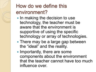 This document discusses preparing the instructional environment for integrating information and communication technology (ICT) into lessons. It defines the learning environment as including physical spaces, cyber spaces, technological infrastructure, human support, policies, social/cultural contexts, and curriculum/assessment practices. An effective 21st century learning environment creates practices and spaces to support 21st century skills, enables professional collaboration among educators, allows students to learn through real-world projects, provides equitable access to technology/resources, uses modern architectural designs, and supports community involvement in learning. The document also examines how to assess a local learning environment's readiness for ICT integration in terms of access, policies, attitudes, budgets, resources, professional development, and teacher preparedness.
