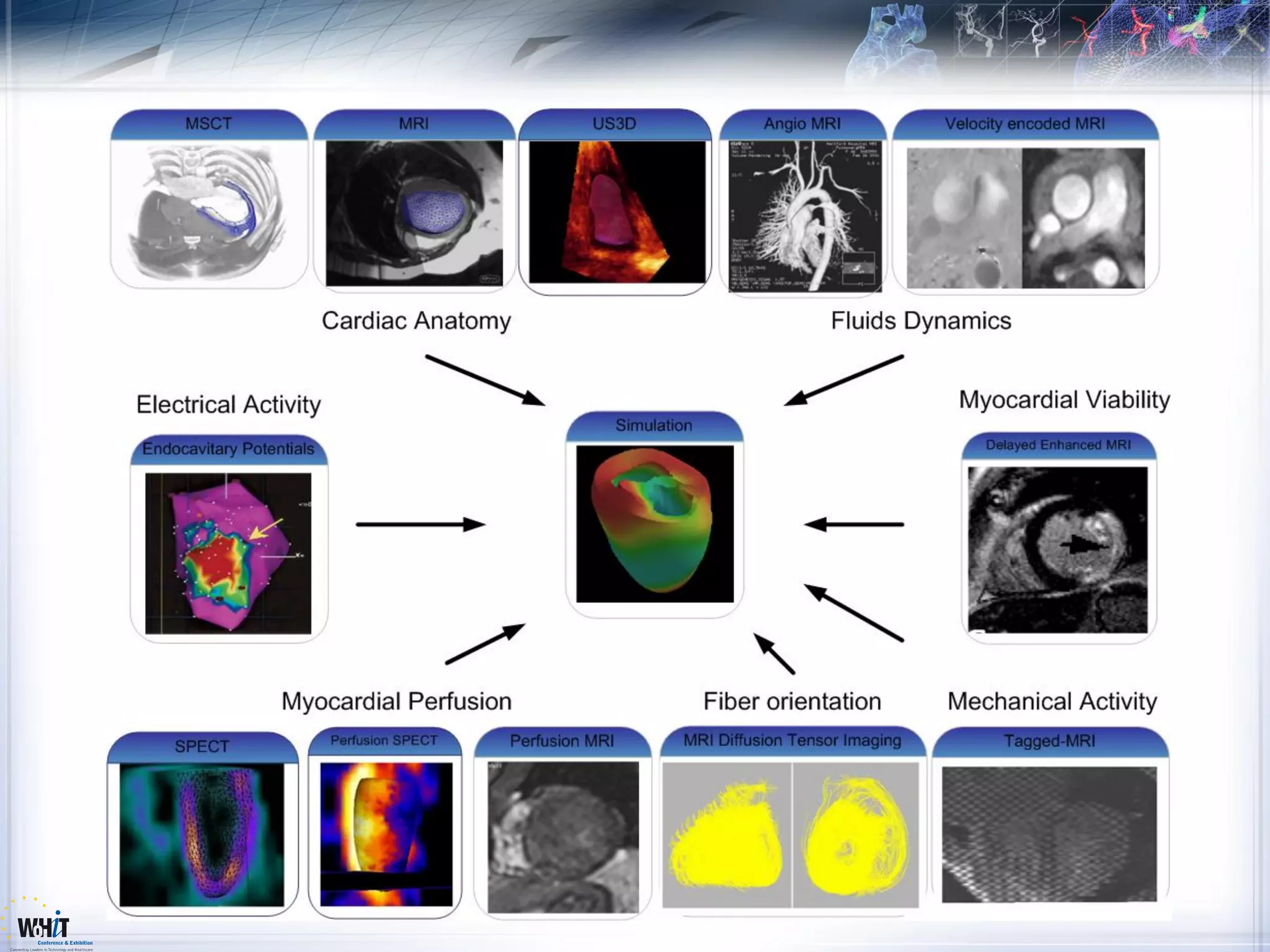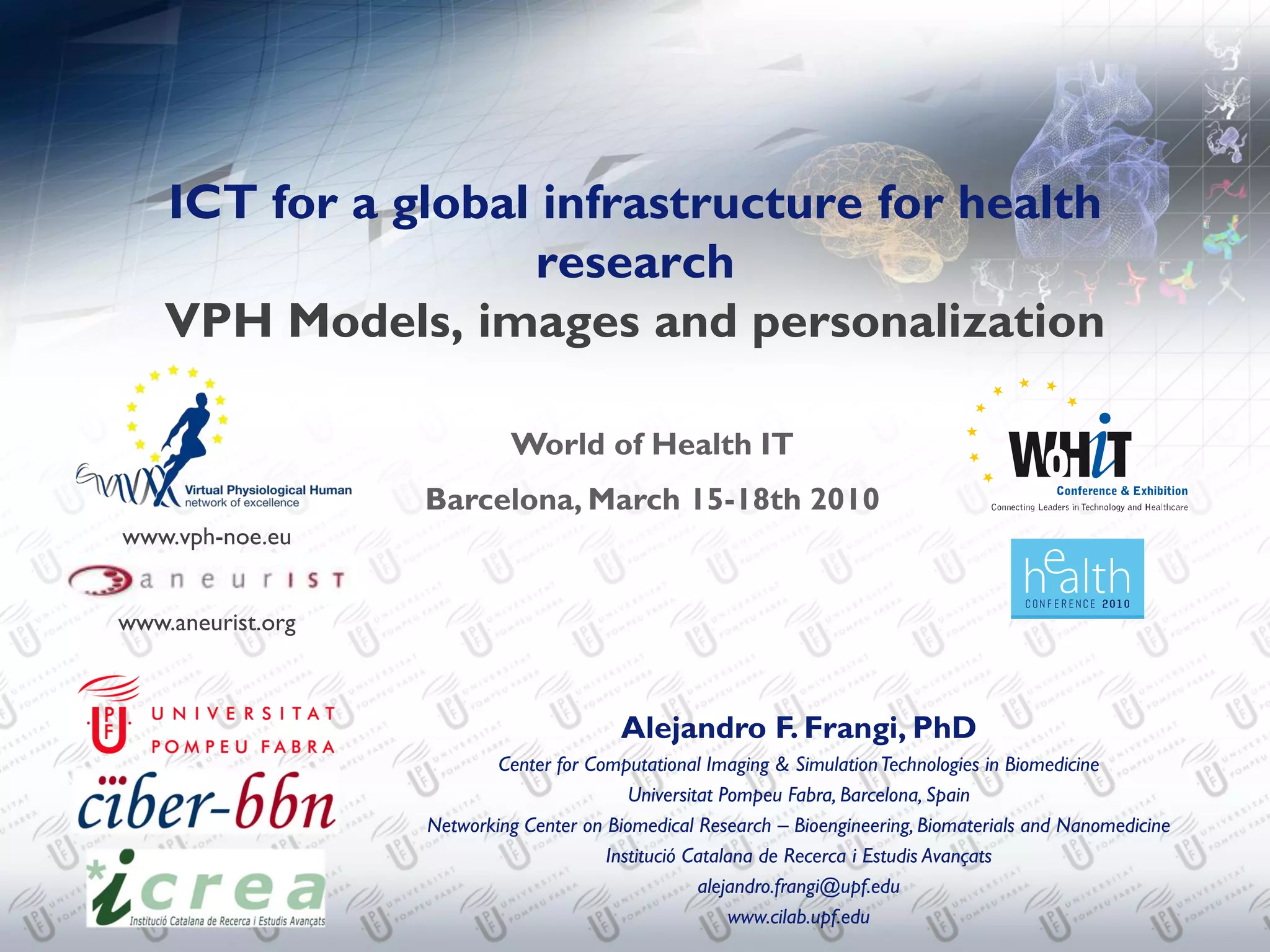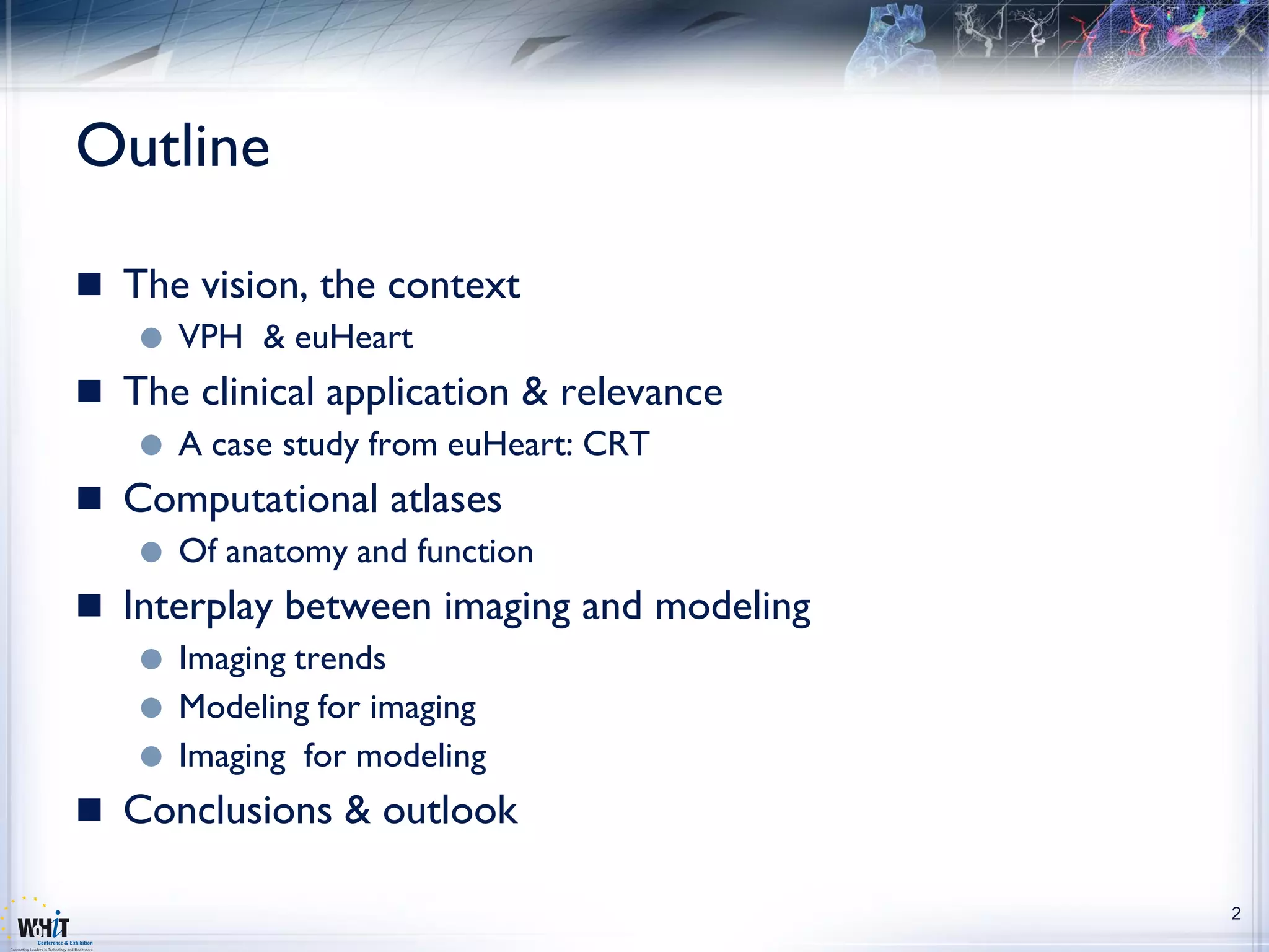 The document discusses the Virtual Physiological Human (VPH) project, aimed at improving diagnosis and treatment of cardiovascular diseases through a network of European institutions. It highlights the integration of ICT tools and multi-scale computational models within clinical environments as key objectives to optimize healthcare delivery. The project aims to utilize advanced biomedical imaging and personalized models for better patient outcomes in various cardiac conditions.
