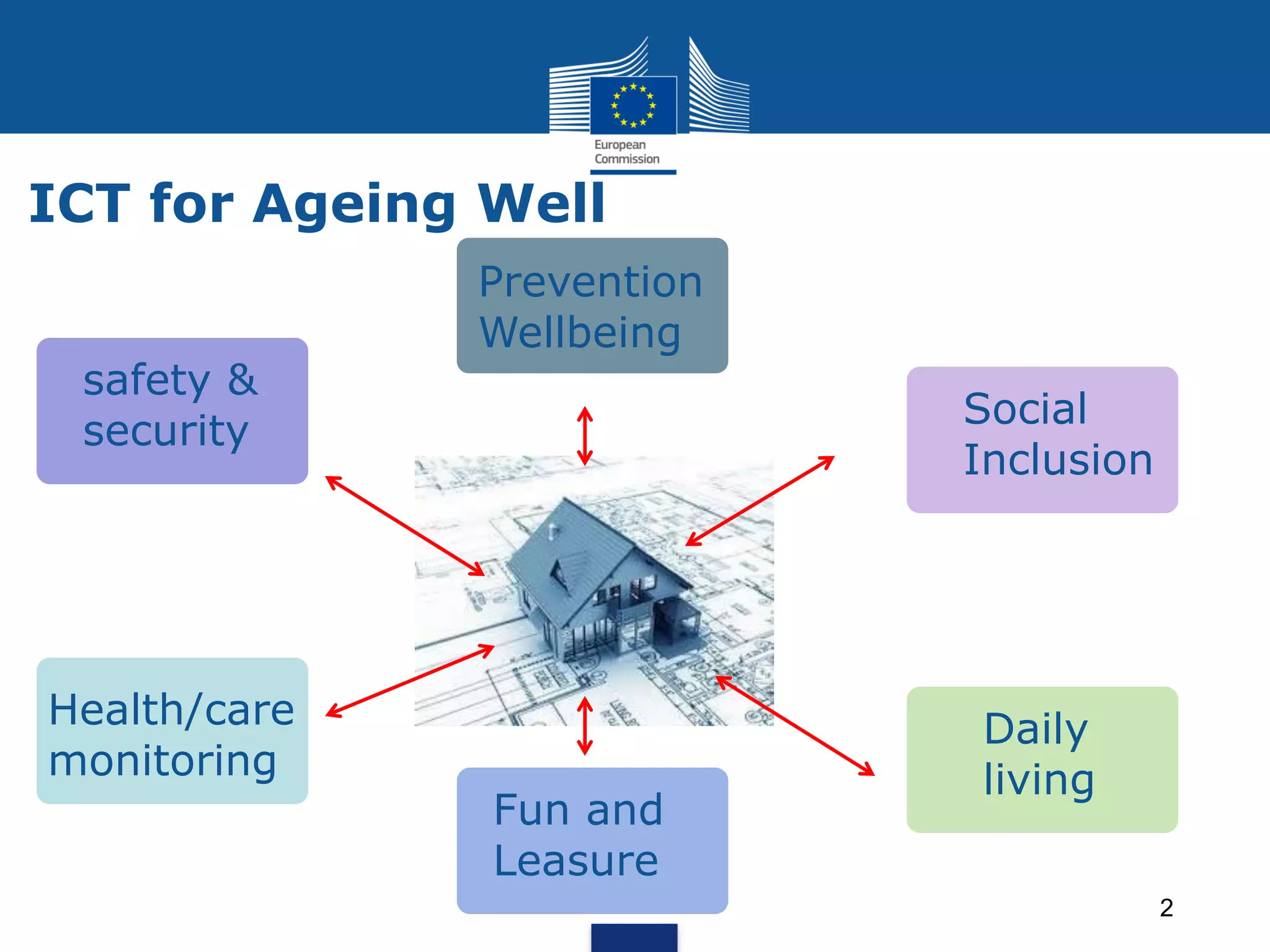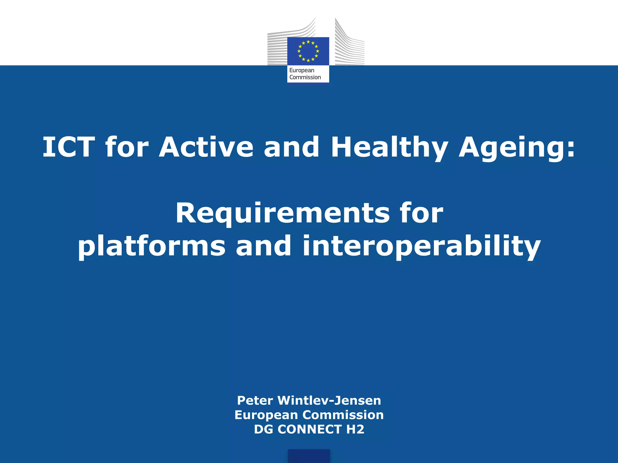 The document outlines requirements for ICT platforms to support active and healthy ageing, focusing on innovative collaboration to enhance health and wellbeing for European citizens. It emphasizes the need for system integration, adaptability, and personalized services across various sectors. Upcoming EU support initiatives are mentioned, aimed at fostering smart living environments and developing standards for interoperability.