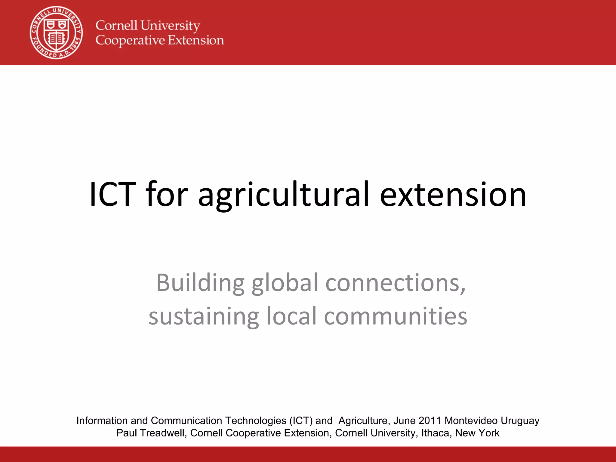 The document discusses the use of information and communication technologies (ICT) to support agricultural extension work. It provides examples of how Cornell Cooperative Extension has used technologies like online learning platforms, videoconferencing, and mobile apps to deliver educational programs across New York State. While ICT increases access to information and opportunities for collaboration, challenges remain around digital literacy and universal broadband access. The document advocates for inclusive, sustainable ICT models that respect local knowledge and engage new technologies like mobile and social media.